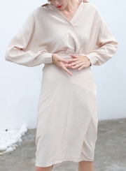 • Pink V Neck Long Sleeve Waist Tie Slim Solid Color Midi Dress